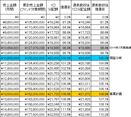 事業計画上の本匿名組合契約会計期間(1年間)の累計売上金額(税抜)は162,000千円(月額平均13,500千円)であり、本匿名組合における累計リクープ売上金額(税抜)は130,000千円(月額平均10,833千円)です。なお、営業者の実績は下記のとおりです。