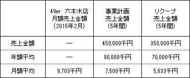 事業計画上の本匿名組合契約会計期間(5年間)の累計売上金額(税抜)は450,000千円(年平均売上金額90,000千円、月平均売上金額7,500千円)であり、本匿名組合における累計リクープ売上金額(税抜)は350,000千円(年平均売上金額70,000千円、月平均売上金額5,833千円)です。なお、営業者の49er六本木店における2015年3月の売上金額(税抜)は約9,703千円です。