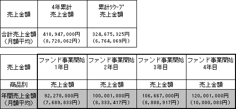 事業計画上の本匿名組合契約会計期間の予想累計売上金額は418,947千円(年平均売上金額104,736千円)であり、本匿名組合における累計リクープ売上金額は324,675千円(年平均売上金額81,168千円)です。