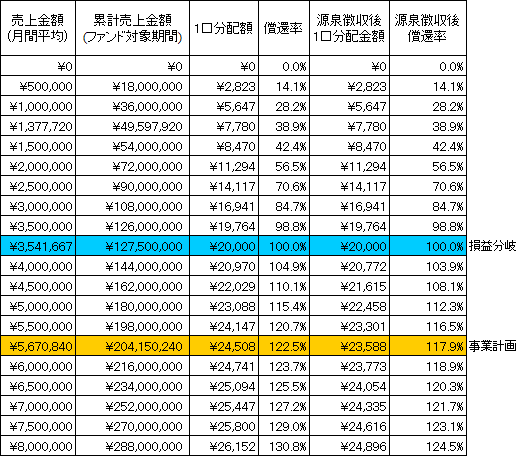 事業計画上の本匿名組合契約会計期間(2015年1月~2017年12月)の累計売上金額(税抜)は204,150千円(月平均売上金額5,670千円)であり、本匿名組合における累計リクープ売上金額(税抜)は127,500千円(月平均売上金額3,541千円)です。なお、営業者の2014年7月の月間売上金額(税抜)は約1,380千円(実績)です。