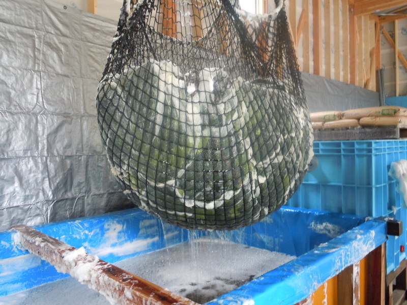 基本的に、昆布は、収穫→茹でる→塩水に漬ける→水をきる→選別して袋詰→出荷、