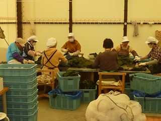 (めかぶ漬の作業風景です。)