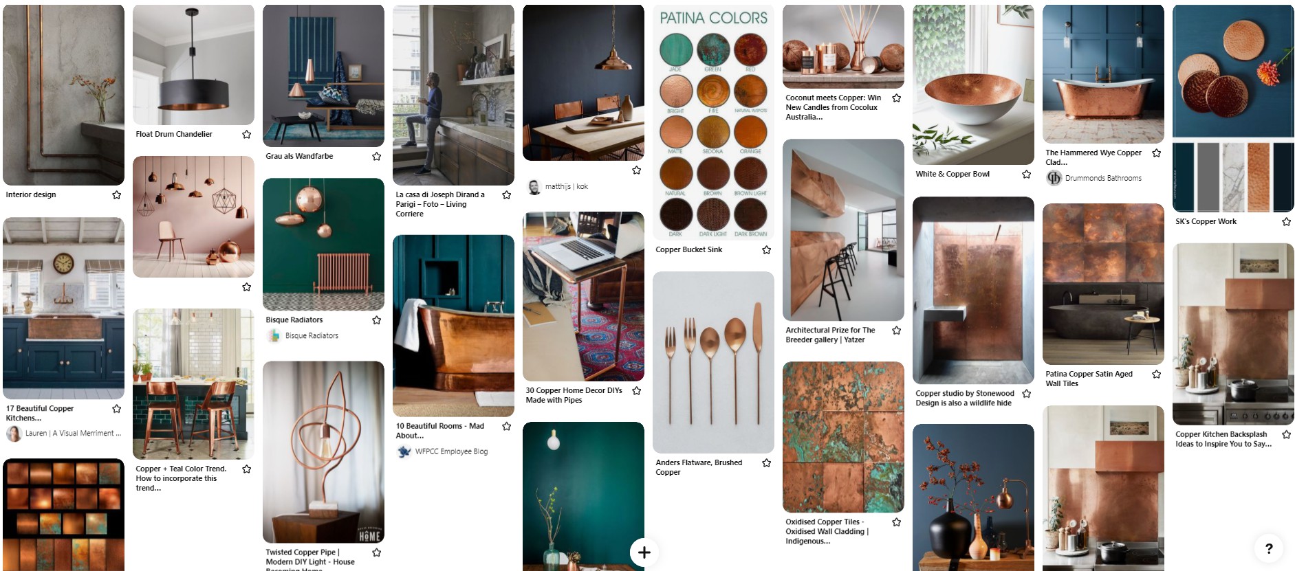つづいて、日本の茶筒や10円玉からインスピレーションを受け、インテリア用にアレンジをした、Copper(コッパー)です。Pinterestで作成したイメージボードをお見せします。商品はこちらのページでご確認ください。銅色は、暗めの背景と合わせてもお色が引き立ち、とても綺麗です。是非お気に入りのアクセサリーのご収納などにもお役立てください。