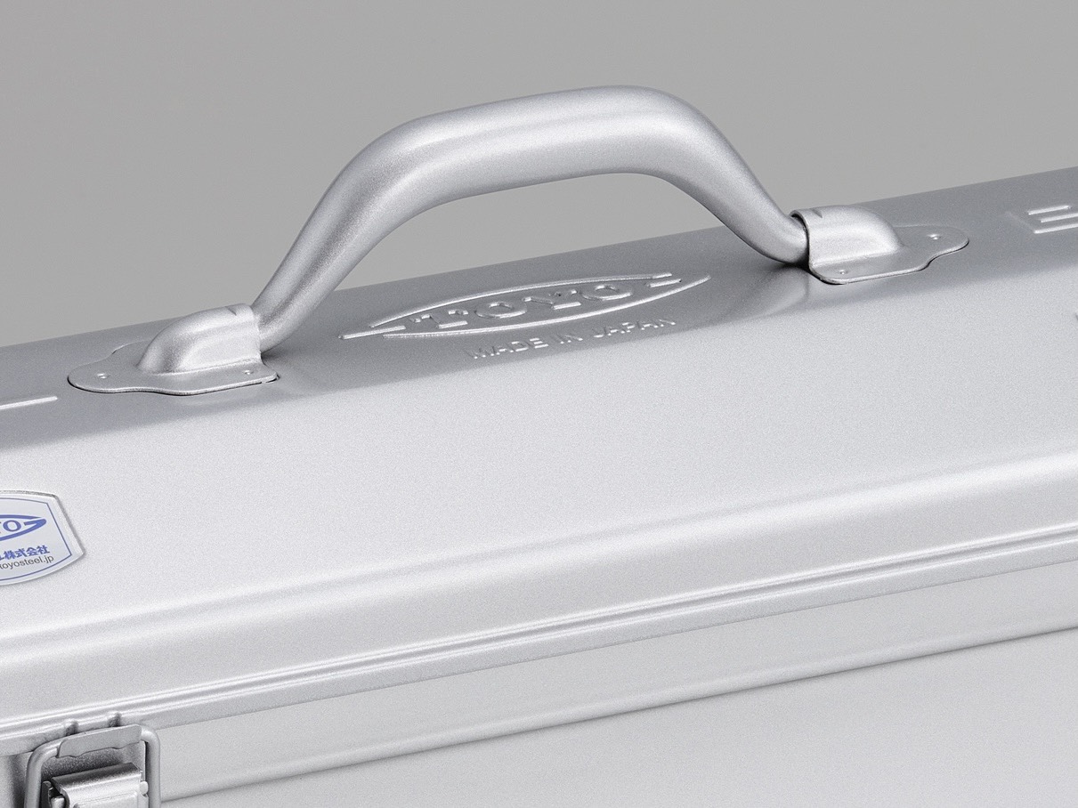 さて、こちらが【Y-410】です。歴史のある東洋スチールらしい山形工具箱、お色はブルー・ブラック・シルバーの定番3色での登場です。独自のプレス加工でつくられた、長いフォルムのデザインがスタイリッシュ。たっぷりご収納戴けます。二箇所の掛け金もどこかレトロでかわいらしく、堅牢な品質と美観に優れた商品です。手に優しく馴染む、丸いハンドルが特徴のY-410。東洋スチールは、創業当時から、”人と道具の優しい関係”を大切にしています。商品はこちらのページでご確認ください。