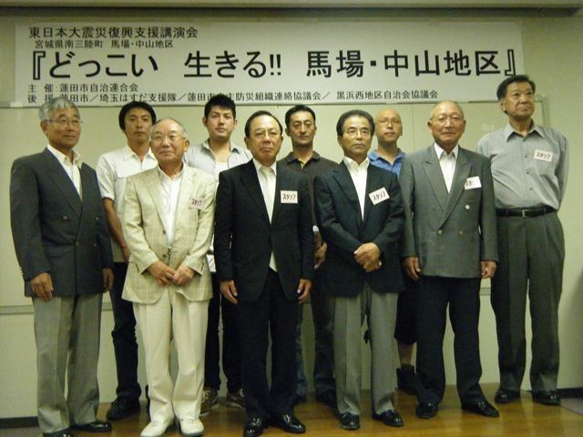この頃の大きな出来事の一つが9月10日に我らが歌津/馬場中山地区の強力な応援団である“はすだ支援隊”の埼玉県蓮田市さんから直々にご招待いただき、我々の被災の状況からこれまでの半年の歩みをお話しする場を作っていただきました。題して、『どっこい生きる!!馬場・中山地区』――この“どっこい生きる”というキャッチフレーズと申しますか枕詞は、実は被災した当初、4月か5月頃にNHKさんが我々の孤立集落状態2週間という経験談をつぶさに取材した結果、ニュースで長めに取り上げてくださったときにつけられたタイトル、『孤立集落、どっこい生きる!』からきています。それ以来、追加取材を頂いて放映されるたびにこの“どっこい生きる!”という表現がよく使われました。