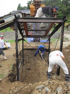 8月にはほぼ完成した未来道ですが、2011年も9月に入って雨が降ったりやんだりという日が続きました。最低限の出来る範囲でルート全体に砂利を敷き詰めた未来道は、少しの雨でもぬかるんで水がたまったままのところがところどころ出来ます。しかし、まだまだ物資が乏しい中、行政の力を借りずに地域住民で作った未来道には充分な砂利を敷き詰めるお金がありません。にわか工事の避難道としてはこれで充分かと思っていたのですが、そこにまたプロの助言が届きました。